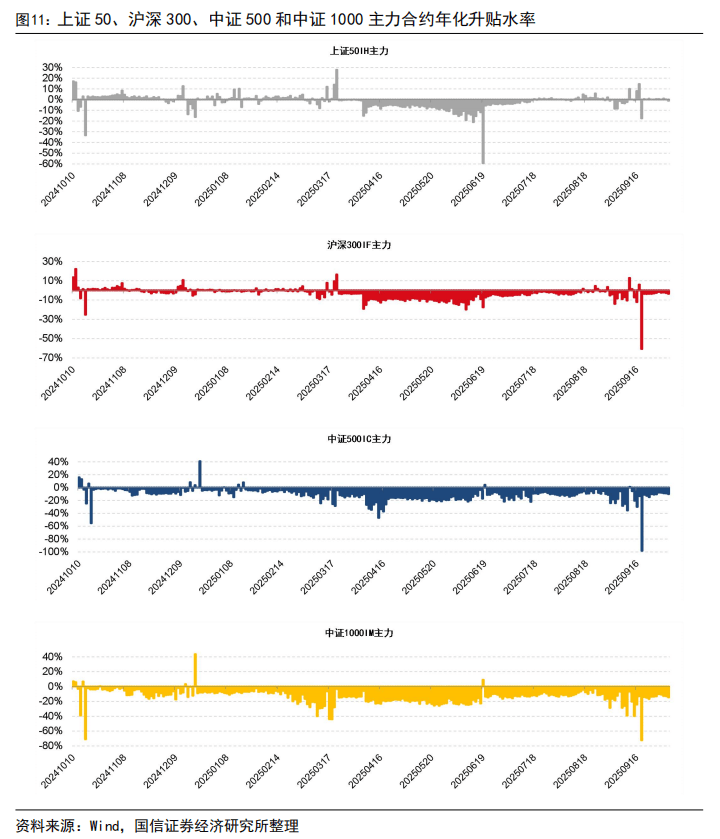 近一年以来上证50、沪深300、中证500、中证1000股指期货主力合约的年化贴水率中位数分别为0.04%、2.55%、10.16%、12.72%,20251013当日上证50股指期货主力合约年化贴水率为0.96%,处于近一年来40%分位点,当日沪深300股指期货主力合约年化贴水率为3.48%,处于近一年来41%分位点;当日中证500股指期货主力合约年化贴水率为10.07%,处于近一年来51%分位点;当日中证1000股指期货主力合约年化贴水率为14.52%,处于近一年来37%分位点。近一年上证50、沪深300、中证500和中证1000主力合约年化升贴水率如下图所示。