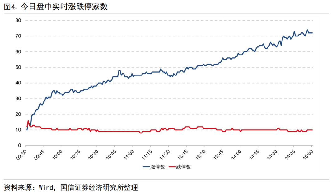 我们统计上市满3个月以上的股票在今日盘中的实时涨跌停家数情况。今日盘中最高有74只股票涨停,收盘时有72只股票涨停,盘中最高有16只股票跌停,收盘时有10只股票跌停,今日日内实时涨跌停家数如下图所示。