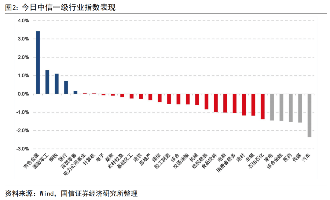 今日有色金属、国防军工、钢铁、银行、商贸零售行业表现较好,收益分别为3.43%、1.30%、1.11%、0.71%、0.17%,汽车、传媒、医药、综合金融、家电行业表现较差,收益分别为-2.36%、-1.56%、-1.52%、-1.47%、-1.45%,中信一级行业指数今日表现如下图所示。