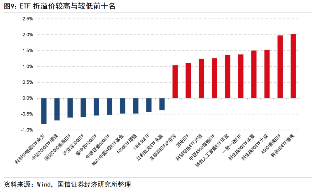 ETF是一种在交易所上市交易的、基金份额可变的开放式基金,其可在场外进行申购赎回,也可以在场内交易。其在场内交易的价格与场外价格的差距在一定程度上反映了投资者的情绪。这里我们统计日成交额超过100万的境内交易股票型ETF的折溢价情况。20251010当日溢价较多的是科创50ETF增强,溢价2.02%,折价较多的是科创50增强ETF南方,折价0.81%,折溢价较高与较低的前十名ETF如下图所示。