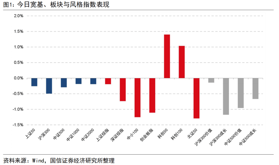 风格指数中,沪深300价值指数表现较好,沪深300价值指数下跌0.14%,沪深300成长指数下跌1.17%,中证500价值指数下跌0.96%,中证500成长指数下跌0.67%。主要宽基、板块及风格指数今日表现如下图所示。