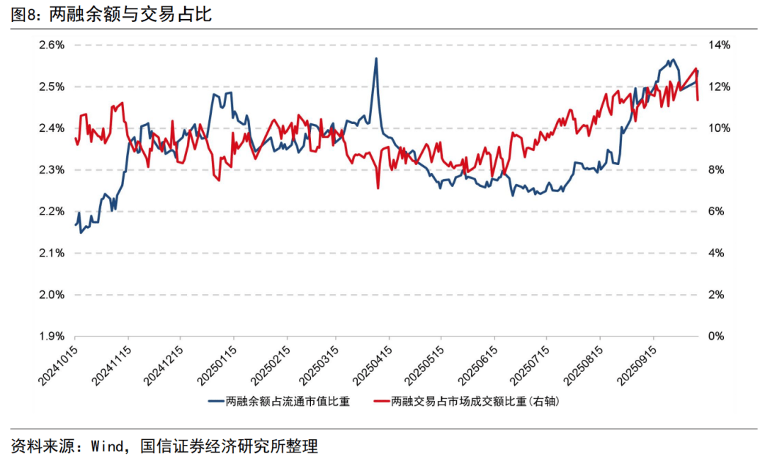 我们计算两融余额占市场总流通市值的比重与两融交易(融资买入额+融券卖出额)占市场总成交额的比例来反映两融交易的活跃情况。近一年来两融余额占流通市值的比重维持在2.3%左右,两融交易占市场成交额的比重维持在9.6%左右,截至 20251010 两融余额占流通市值比重为2.5%,两融交易占市场成交额比重为11.4%,近一年两融余额与交易占比如下图所示。