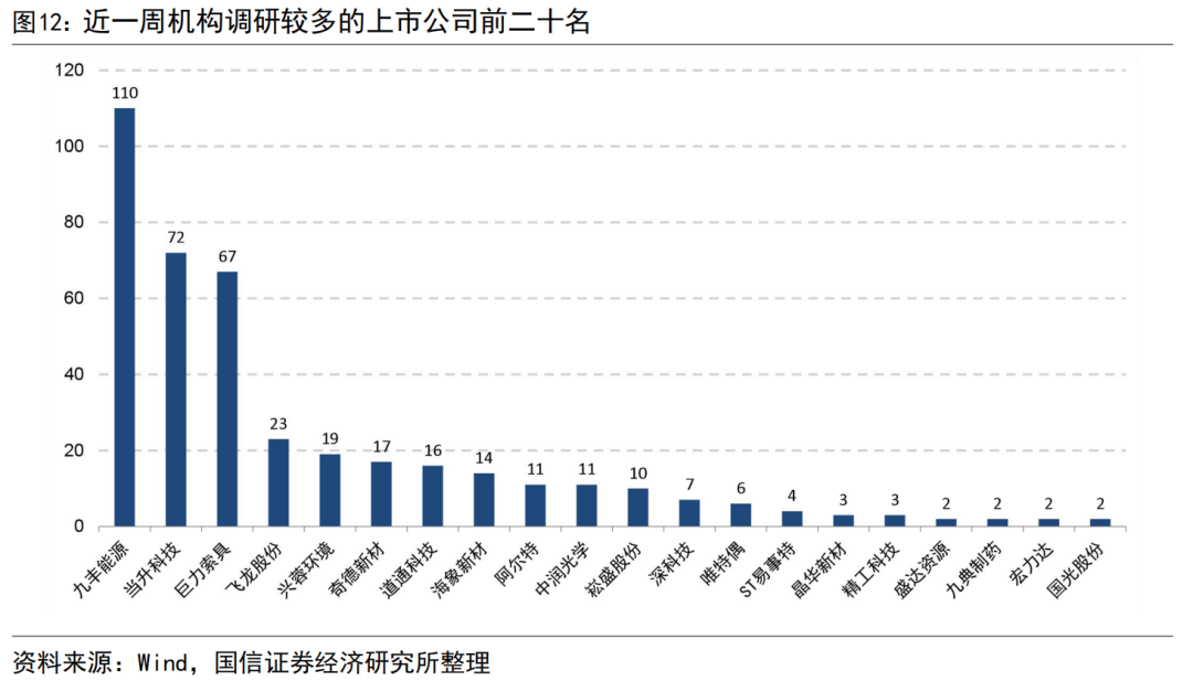 上市公司会披露投资者或分析师对其的调研活动。这里我们统计近7天内对上市公司调研或举行分析师会议的机构数量。下图展示了近一周内被机构调研较多的前二十名上市公司,不足二十名时直接取现有数量。可以看到,近一周内调研机构较多的股票是九丰能源、当升科技、巨力索具、飞龙股份、兴蓉环境、奇德新材、道通科技、海象新材等,九丰能源被110家机构调研。