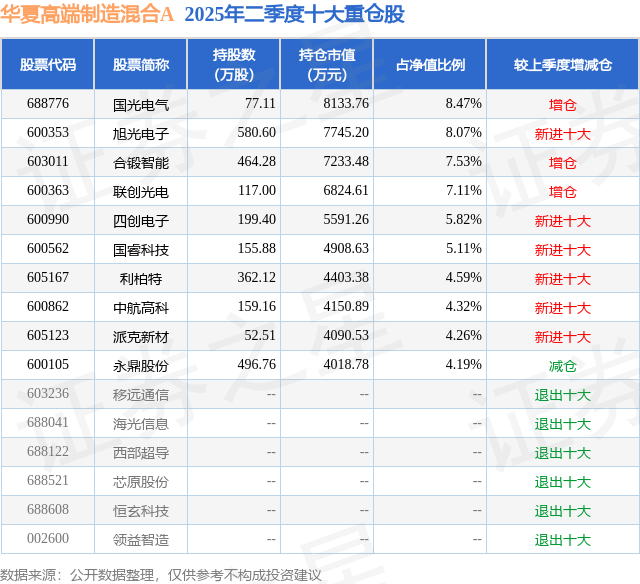 根据2025基金半年报公募基金重仓股数据,重仓该股的公募基金共10家,其中持有数量最多的公募基金为华夏基金的华夏高端制造混合A。华夏高端制造混合A目前规模为8.99亿元,最新净值1.425(10月16日),较上一交易日上涨0.56%,近一年上涨17.09%。该公募基金现任基金经理为吴昊。