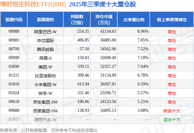 从基金规模来看,博时恒生科技ETF(QDII)基金2025年三季度公布的基金规模为45.95亿元,较上一期规模21.09亿元变化了24.86亿元,环比变化了117.87%。该基金最新一期资产配置为:股票占净值比95.87%,无债券类资产,现金占净值比7.0%。从基金持仓来看,该基金当季前十大股票仓位达66.34%,第一大重仓股为阿里巴巴-W(09988),持仓占比为8.96%。