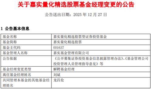 2025年12月27日,嘉实基金旗下嘉实量化精选等两只基金同步发布了基金经理变更公告,均指向了刘斌的卸任。这是自洪流、金猛等老将“清仓式”卸任,以及今年上半年12名基金经理离任后,旗下又一次基金经理变动。
