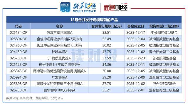 具体来看,12月合并发行规模最大的产品为信澳丰享利率债。该基金于12月18日发布公告称,基金有效认购户数为317户,基金合同于12月17日正式生效。该基金类型为中长期纯债型基金,基金经理为赵琳婧,合并发行规模为52.51亿元。