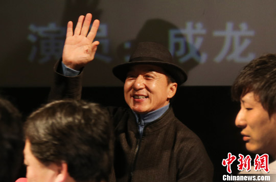 12月21日晚,著名演员成龙携女星张蓝心、姚星彤来到南京,参加新片《十二生肖》观众见面会。中新社发 泱波 摄