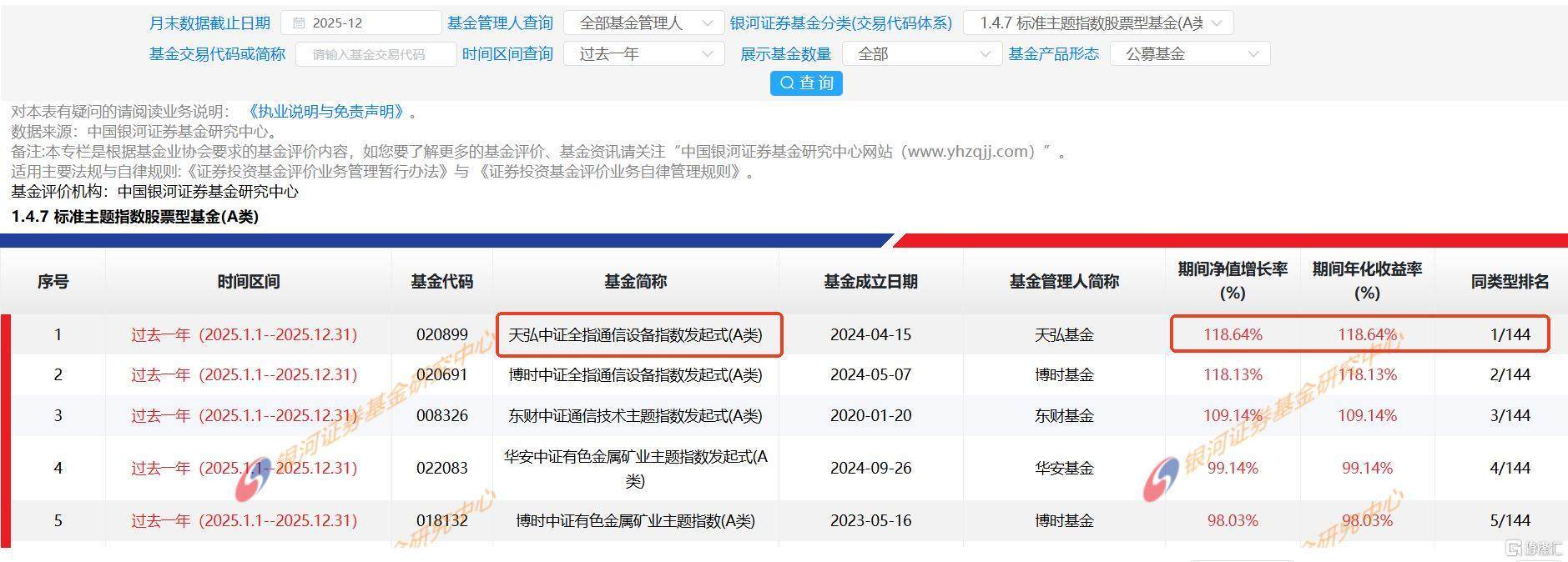 注:根据产品定期报告,天弘中证全指通信设备指数基金成立于2024年04月15日,成立以来完整会计年度产品业绩及比较基准业绩为A类:2025年+118.64%(+117.72%),C类:2025年+118.21%(+117.72%)。
