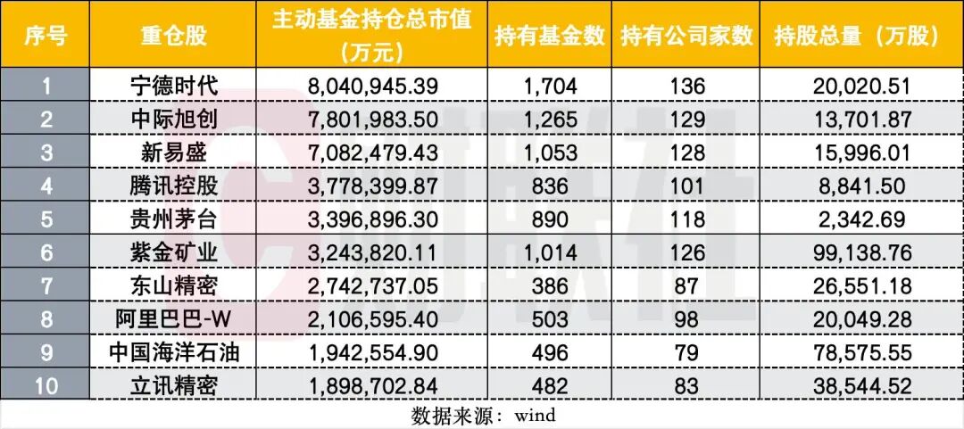 据wind统计,截至今年一季度末,公募主动基金前十大重仓股依次为:宁德时代、中际旭创、新易盛、腾讯控股、贵州茅台、紫金矿业、东山精密、阿里巴巴-W、中国海洋石油、立讯精密,持仓总市值分别为804.09亿元、780.2亿元、708.25亿元、377.84亿元、339.69亿元、324.38亿元、274.27亿元、210.66亿元、194.26亿元、189.87亿元。